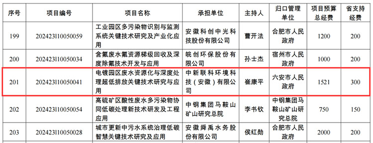 9月10日,安徽省科技廳公示2024年省科技創(chuàng)新攻堅(jiān)計(jì)劃項(xiàng)目立項(xiàng)計(jì)劃。中新集團(tuán)旗下中新綠發(fā)控股子公司中新聯(lián)科環(huán)境科技(安徽)有限公司(簡(jiǎn)稱“中新聯(lián)科”)申報(bào)的“電鍍園區(qū)廢水資源化與深度處理超低排放關(guān)鍵技術(shù)研究與應(yīng)用”項(xiàng)目成功入選。